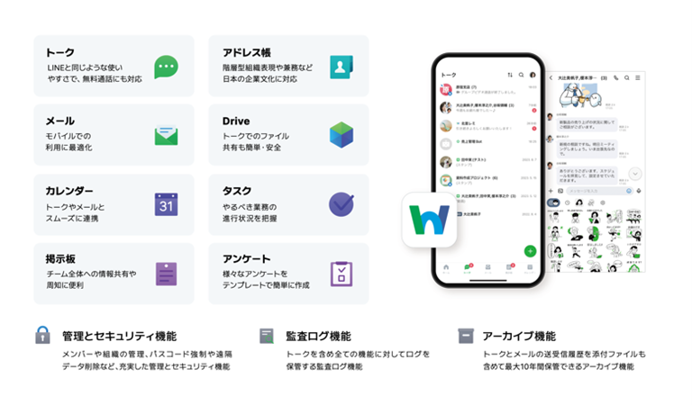 LINE WORKS(東京都渋谷区)は、法人向けビジネスチャットツール「LINE WORKS(ライン ワークス)」を提供する。チャットとスタンプのみではなく、掲示板やカレンダー、アドレス帳、アンケートなど、現場で活用できるさまざまなグループウエア機能をそろえている。