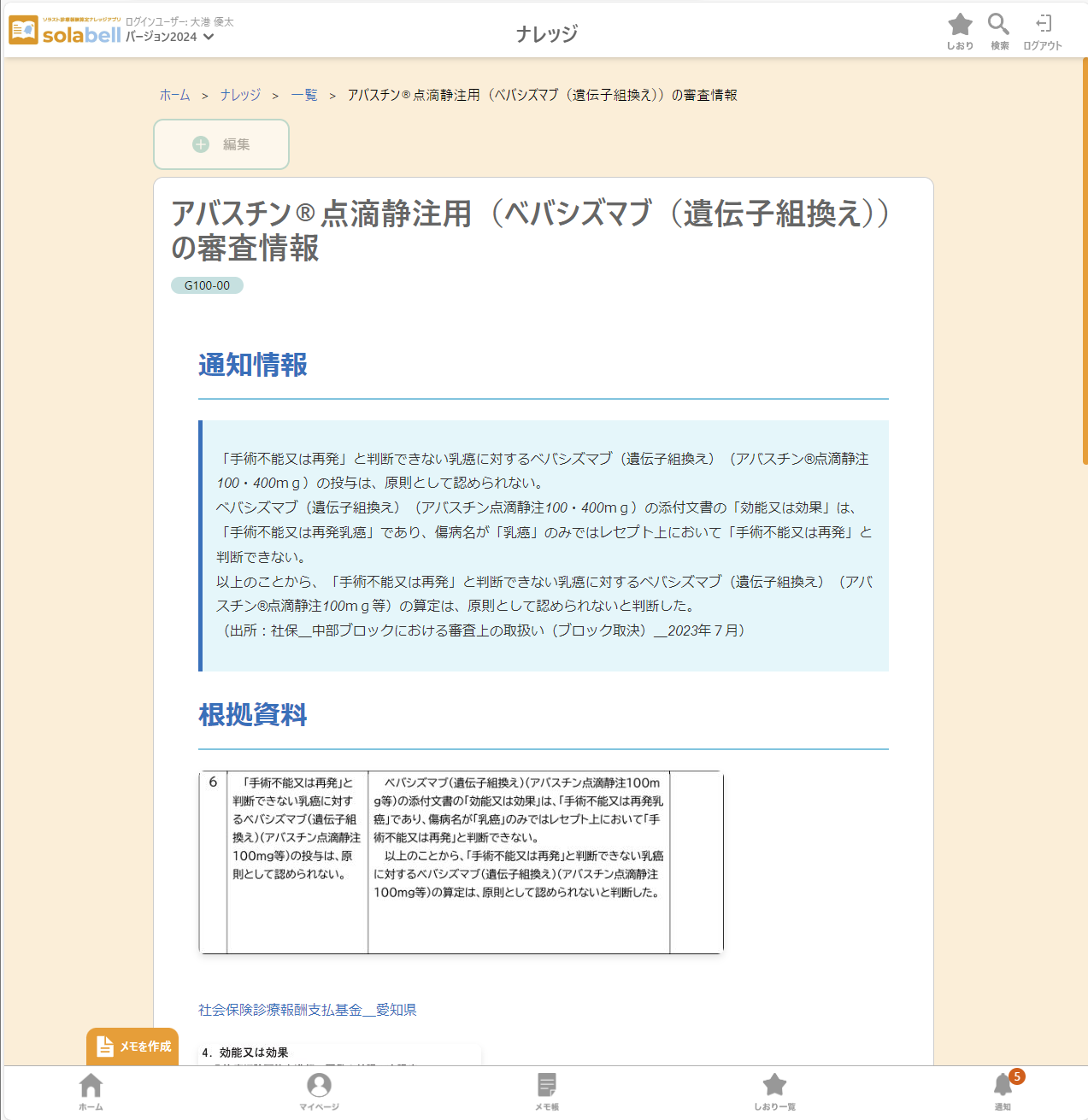 「solabell」の利用によって、診療報酬点数表や関連する書籍の予習、WordやPowerPoint資料への転記作業などは、全て該当ページをしおり機能であらかじめ保存しておくことが可能だ。さらにメモ機能を組み合わせ、指導や確認に使うページのポイントを、自身の言葉で記録しておくことが可能で、説明したかった内容を見失う心配もない。研修などの資料準備に従前は15-30分かかったが、「solabell」の検索、しおり機能登録、メモ機能登録により1-10分程度で終わる。メモを同じ院内で共有でき、容易に院内ルールなどを共有するようになった。