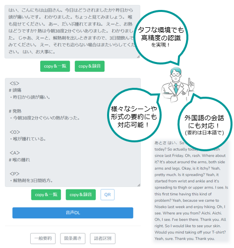 こういった効果を支えているのは、医療コミュニケーションに特化した音声認識とAIだ。医療分野に限定した技術による自社開発で、静かな環境以外でも高精度のアウトプットを実現した。