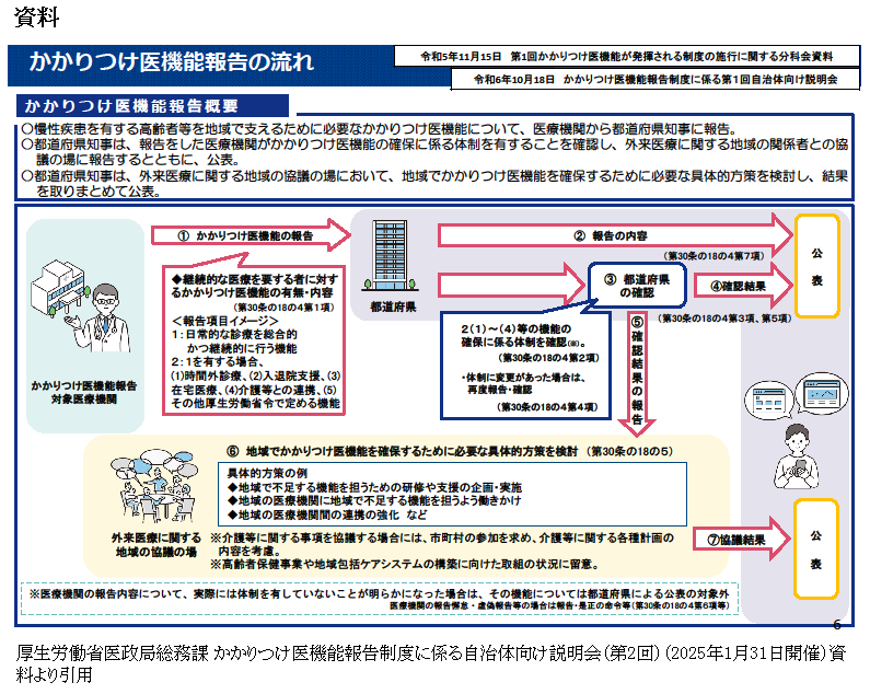 「身近な地域における日常的な診療、疾病の予防のための措置その他の医療の提供を行う機能」をかかりつけ医機能と定義し、「今後、複数の慢性疾患や医療と介護の複合ニーズを有することが多い高齢者のさらなる増加と生産年齢人口の急減が見込まれる中、地域によって大きく異なる人口構造の変化に対応して、「治す医療」から「治し、支える医療」を実現していくためには、これまでの地域医療構想や地域包括ケアの取り組みに加え、かかりつけ医機能が発揮される制度整備を進める必要がある」との趣旨に基づき、かかりつけ医機能報告制度が、2025年4月にスタートする。