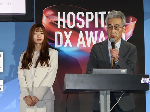 「病院DXアワード」最終審査の舞台で最後のプレゼンテーションに立った渡辺氏。初代大賞を選ぶ瞬間が間近に迫り、会場は緊張の糸で張りつめた空気が漂う中、導入病院として同じ舞台に立った社会医療法人蘇西厚生会松波総合病院副院長の草深裕光氏の一言が会場の雰囲気を和やかにした。
