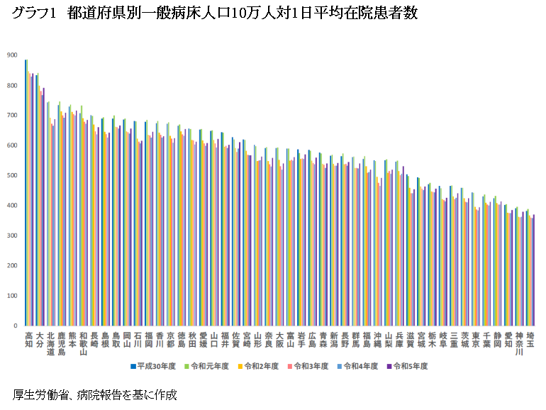 2019年度をピークに多くの地域では入院患者数が減少していることについて本連載で取り上げてきた。グラフ1は、一般病床の人口10万人当たりの1日当たり在院患者数を都道府県別に集計したものであり、地域にもよるが23年度は多少入院患者が戻りつつあるようだ。