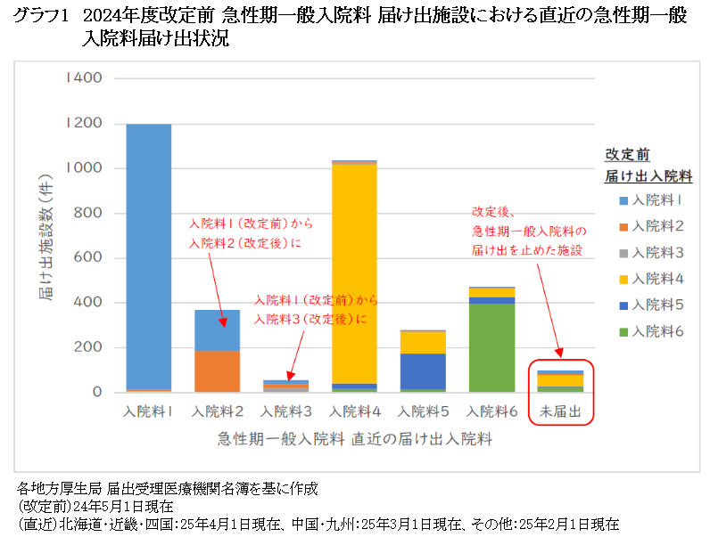 しかし、24年度改定における看護必要度の厳格化の影響は、急性期一般入院料1の届け出施設数・病床数の大幅な減少として顕在化した。具体的には改定前に入院料1を届け出ていた約1,400施設のうち、約180施設が入院料2へ、20施設弱が入院料3へダウングレードした=グラフ1=。グラフ1の赤四角で囲んだ約100施設は、改定前に急性期一般入院料の届け出をしていたが、改定後には別の入院料などに機能転換している。