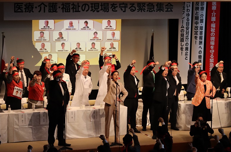 自民党参議院議員の有志らが中心となり、医療・介護・福祉の現場を守る緊急集会を18日に自民党本部で開き、診療報酬や介護報酬、障害福祉サービス等報酬に物価高騰や賃金の上昇に応じて適切にスライドする仕組みを導入するなど4項目を要望する決議を採択した。【渕本稔】