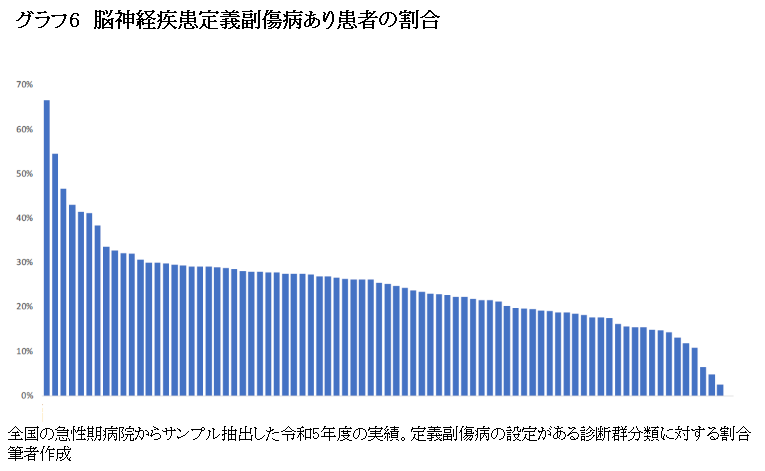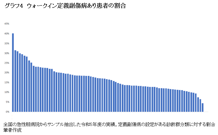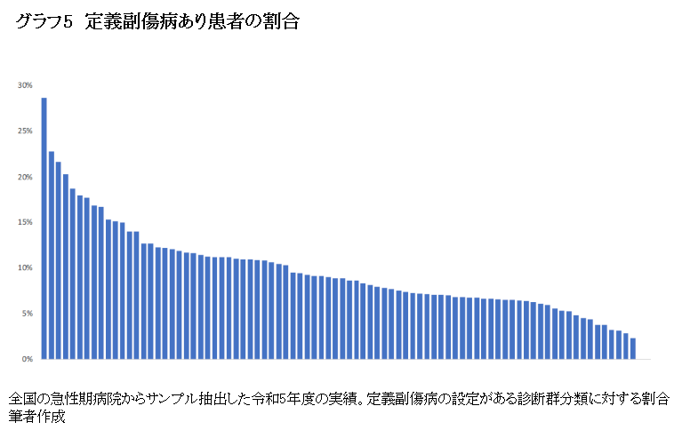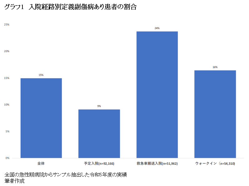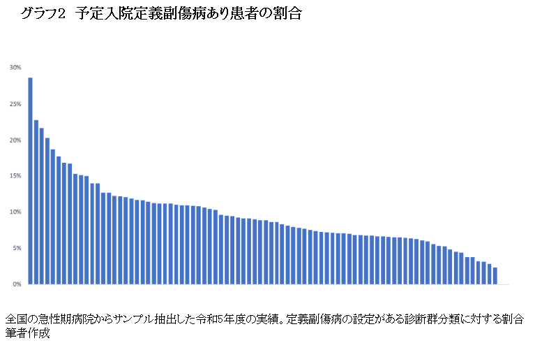 定義副傷病の該当割合について全国の約90病院、定義副傷病に該当する20万症例で、入院経路別に見たものがグラフ1になる。「ちば医経塾」や「岡山大学トラ穴」をはじめ、私が関係する病院のデータで定義副傷病などに前向きに取り組む病院が多いため、DPC対象病院全体よりも少し高い水準かもしれない。ただ、全体の傾向は大きく変わらないと予想され、予定入院患者は定義副傷病の該当率が低く、緊急入院、特に救急車搬送入院で高くなる。
