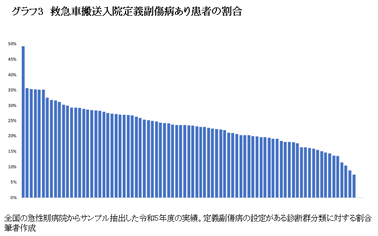 これを病院別で見たものがグラフ2・3・4であり、明らかに救急車搬送入院で定義副傷病の該当率が高いことが分かる。救急車搬送入院は、高齢者で、かつ重篤である傾向が強いため、合併症を有する患者が多くなるという、一般的な理解と整合するのではないだろうか。