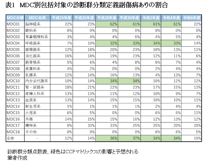 表1は、調整係数が置き換わり、基礎係数が設定された12年度からの改定年ごとにMDC別に包括評価対象患者に限定し、定義副傷病が設定された割合を見たものである。色をつけた部分は、16年度診療報酬改定でCCPマトリックスが導入された影響が色濃く出てくると予想するが、24年度診療報酬改定では以前よりも定義副傷病の設定そのものが大幅に減少した。そもそもMDC02の眼科系は当初から設定がないなど、領域によって状況は異なっているものの、全体的に定義副傷病は減少した。