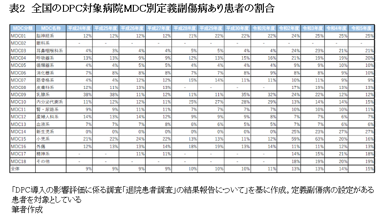 表2は、全国のDPC対象病院について改定年度ごとにMDC別に定義副傷病の設定がある診断群分類について、定義副傷病の該当率を計算したものである。全てのDPC対象病院が含まれており、世の中の平均的な水準である。今までは増加傾向にあったものの、24年度は、定義副傷病の設定変更に伴い大幅に減少していることが予想される。