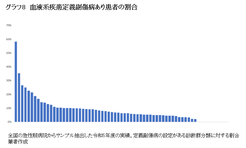 ただし、診療領域によって定義副傷病の該当率は異なるため、該当率が高いMDC01(脳神経系)、対象症例数が多いMDC06(消化器系)、敗血症などの定義副傷病が中心で該当しづらく、かつ対象症例数が少ないMDC13(血液系)を見たものであり、やはり病院によるバラつきは大きい=グラフ6・7・8=。