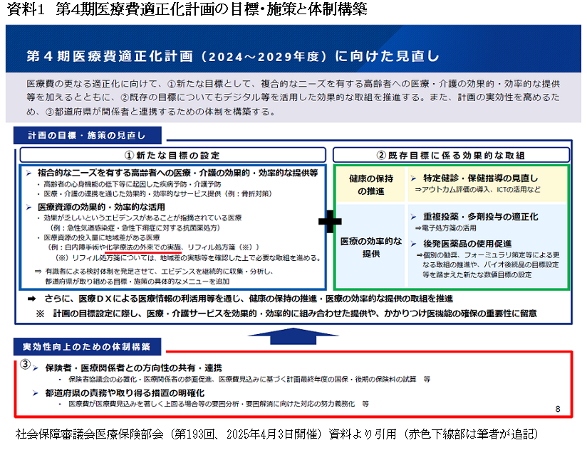 2024年度からスタートした第4期医療費適正化計画=資料1=では、化学療法の外来移行(赤下線)が医療資源の効果的・効率的な活用として、目標に設定されている。