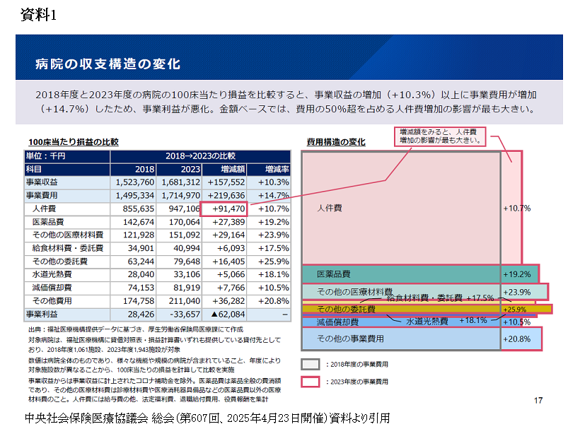 4月23日の中央社会保険医療協議会・総会で示された「病院の収支構造の変化」=資料1=によると、2023年度の病院100床当たりの事業収益は18年度と比較して10.3%増えたものの、事業費用が14.7%増えたため、事業利益は大幅なマイナスに転じた。