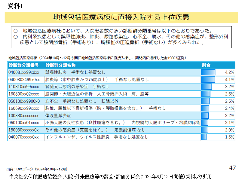 例えば、地域包括医療病棟に直接入院する上位疾患には、誤嚥性肺炎や肺炎、尿路感染症、大腿骨頸部骨折、心不全、圧迫骨折などが挙がった=資料1=。