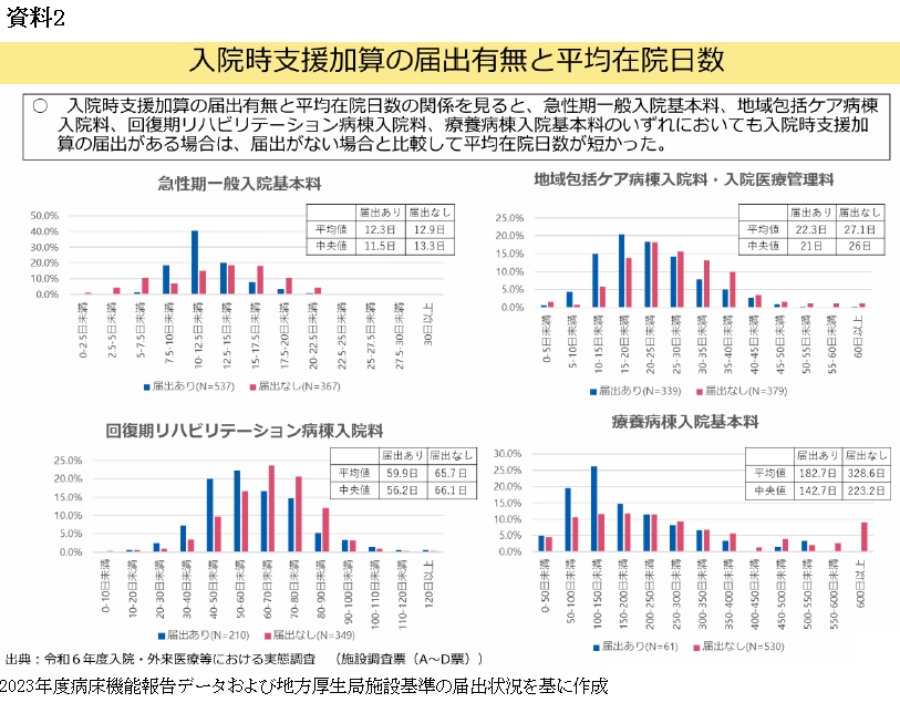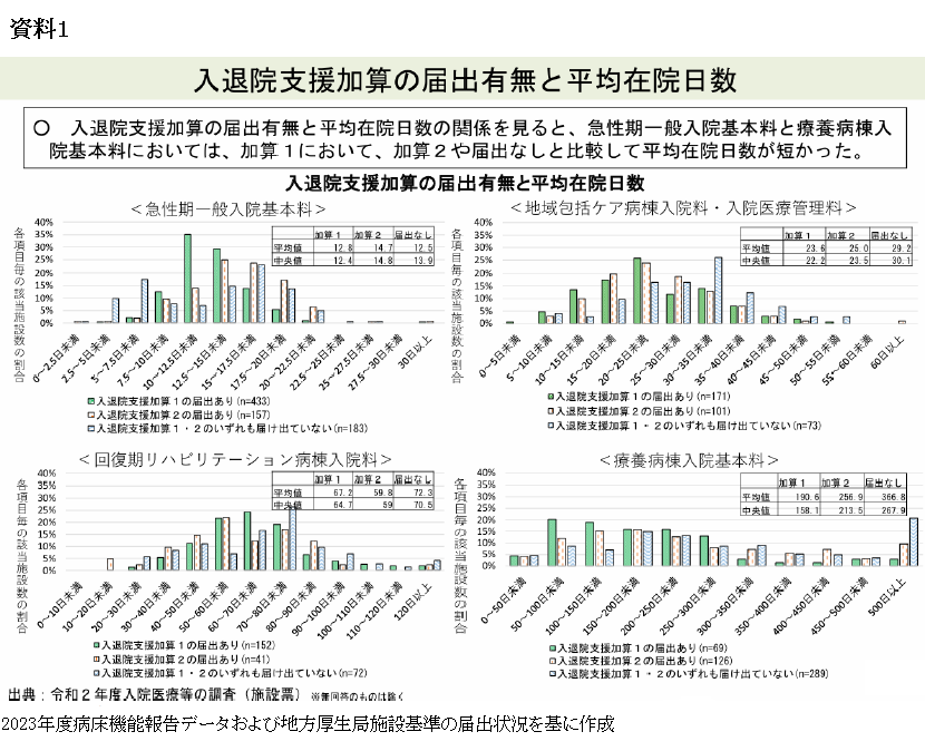 資料1は、20年度の改定を議論した際の資料だ。入退院支援加算の届け出の有無による平均在院日数の差異を見たもので、入退院支援加算1の届け出がある医療機関で平均在院日数が短いことが分かる。中央社会保険医療協議会の「入院・外来医療等の調査・評価分科会」が26年度改定に向けて議論を始めた際の資料でも入院時支援加算の届け出の有無によって平均在院日数に違いがあることが明らかになっている=資料2=。