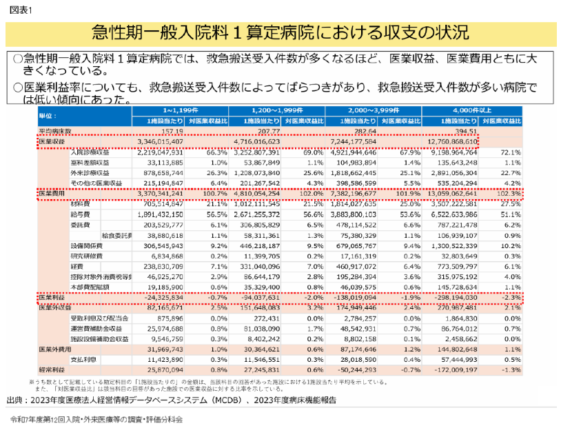 厚生労働省は、医療政策の企画・立案や医療機関の経営支援に活用するために医療法人経営情報データベース(MCDB: Medical Corporation Financial Database System)を整備し、医療法人が報告する情報を収集している。同省は、このデータベースと病床機能報告のデータを結合し、これらを基に9月18日、中央社会保険医療協議会の「入院・外来医療等の調査・評価分科会」に急性期一般入院料1を算定する病院の収支状況を報告した。