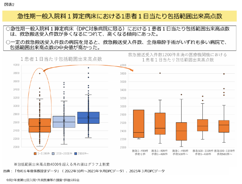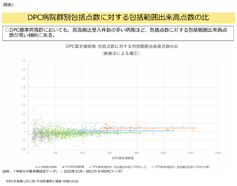 これらを総括すると、救急医療は包括範囲出来高換算点数が高くなるため、DPC/PDPSでは持ち出しが多くなり、