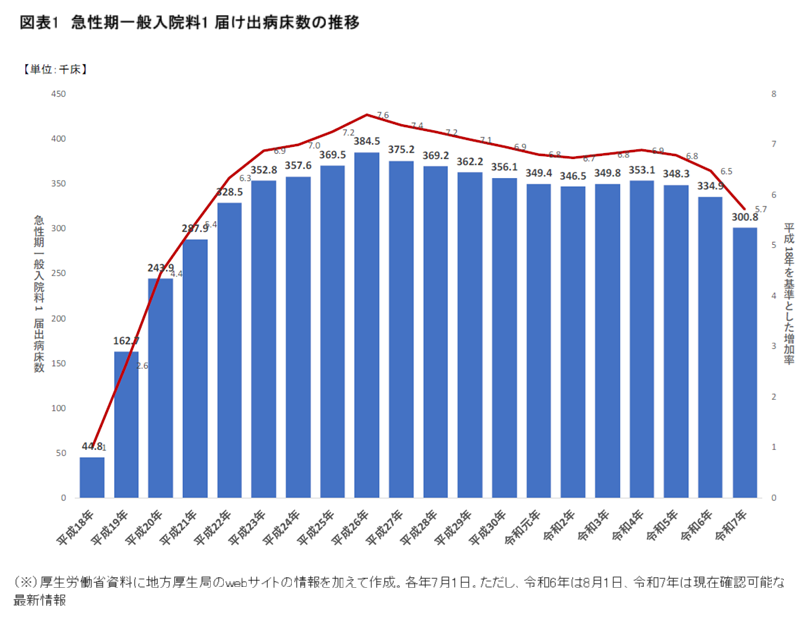ただし、24年度診療報酬改定で「重症度、医療・看護必要度」が厳格化されたことにより、7対1の病床は直近では約30万床まで減少し、今後も適正化の方向に進みそうな気配もある。24年度から25年度に約3万床減少したが、これらの多くは急性期一般入院料2に転換した。