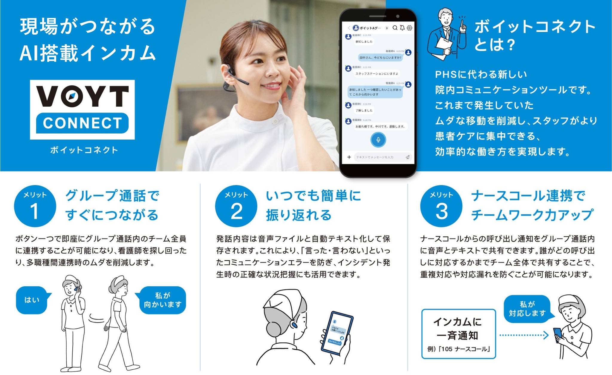 VOYT CONNECTは、AIを搭載。発話内容はAIによってリアルタイムに自動テキスト化され、会話の履歴として蓄積される。医療用語や薬剤名に対応した辞書登録機能により実用性を確保し、「言った・言わない」といった認識齟齬による確認作業や手戻りを防止する。また、ナースコールや見守りセンサーなど外部システムからの呼び出しを、インカムのグループ内に音声とテキストで通知する連携機能(特許取得済み)を搭載。誰がどの対応を行っているかをチーム全体で共有でき、重複対応や対応漏れといったリスクを低減している。