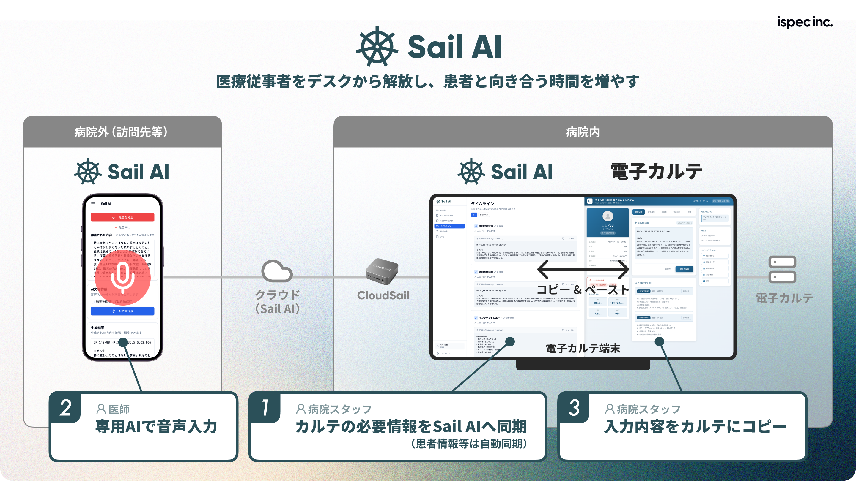 ispec(東京都品川区)の「Sail AI」(セイル エーアイ)は、訪問診療やリハビリ、病棟回診などで移動したり、処置したりし“ながら”の利用をイメージしたAI音声入力システムだ。医療現場での「デスクの前にいないと情報が見られない」「カルテ記録ができない」という物理的な課題解消に貢献する。