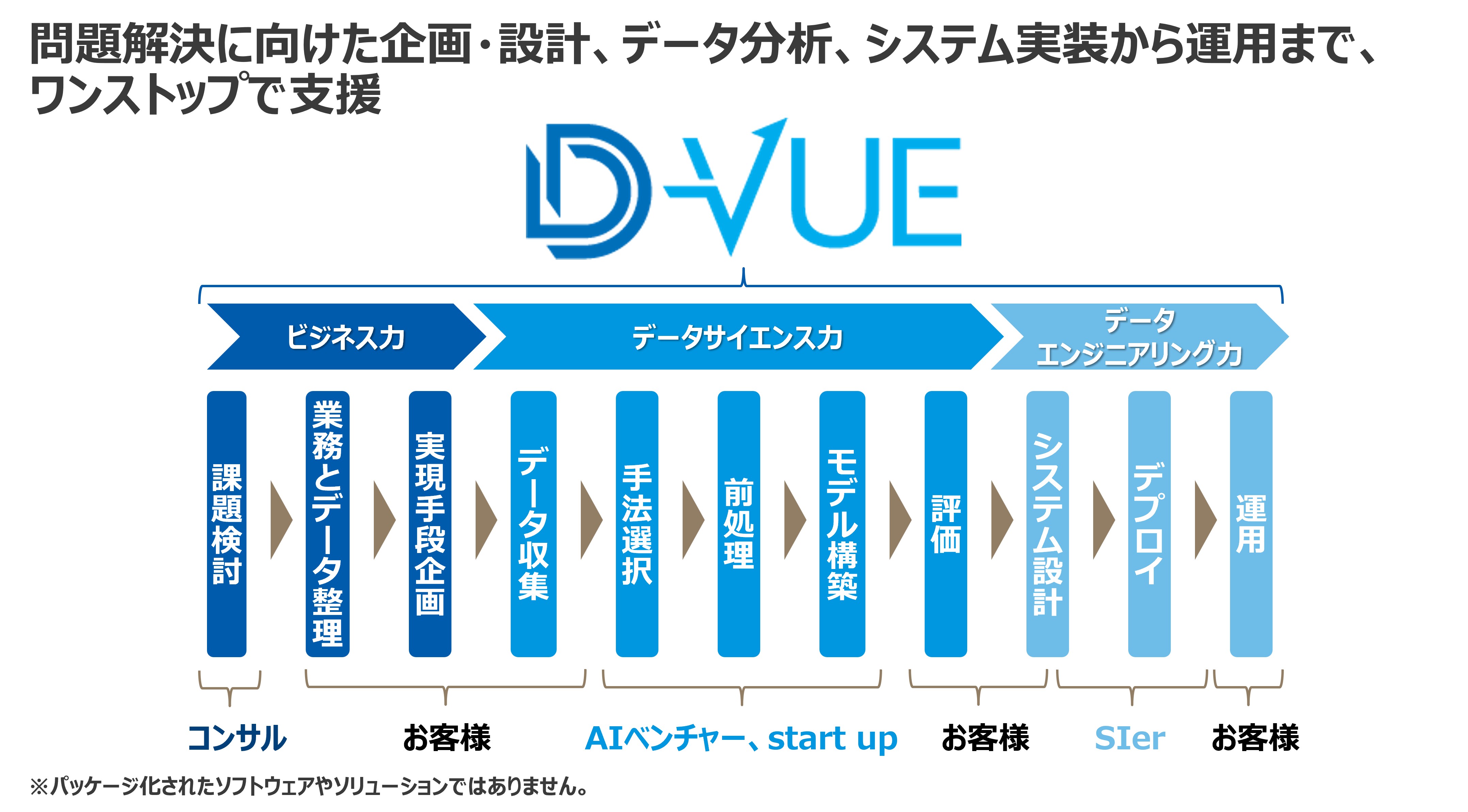 D-VUEでは、残業が減らない、業務が属人化しているといった日々の現場課題を丁寧に洗い出し、現場と合意形成を行いながら改善テーマを設定する。データの整理や業務プロセスの可視化、AI・データ分析手法の選定、システム設計・運用までを一体的に進めることで、現場と経営の分断を防ぎ、「理解でき、使えるデータ活用」を実現している。