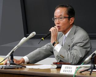 記者会見で後継法人について説明する琴尾副区長(9月16日、練馬区役所内)