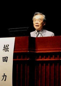 日本認知症ケア学会大会で講演する「24時間地域巡回型訪問サービスのあり方検討会」元座長の堀田力・さわやか福祉財団理事長(9月24日、横浜市)