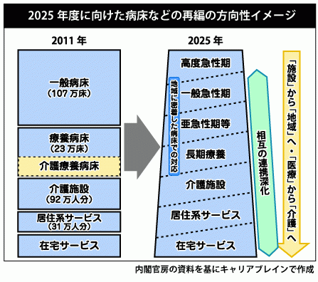 一体改革の成案は、約107万床ある現在の一般病床を、2025年度までに高度急性期(18万-22万床)、一般急性期(35万-46万床)、亜急性期(26万-35万床)などに再編する内容。一方、DPC制度をめぐっては12年度の診療報酬改定で、DPC対象病院を診療実績などに応じて幾つかのグループに分け、現行の調整係数に代わる基礎係数をグループごとに設定することになっている。これまでの議論では、「大学病院本院」を1つのグループにすることがほぼ決まっている。