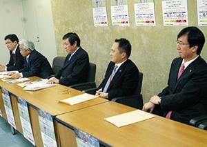 ヘモグロビンA1cの表記を改めると発表した3団体の関係者ら(20日、厚生労働省内)