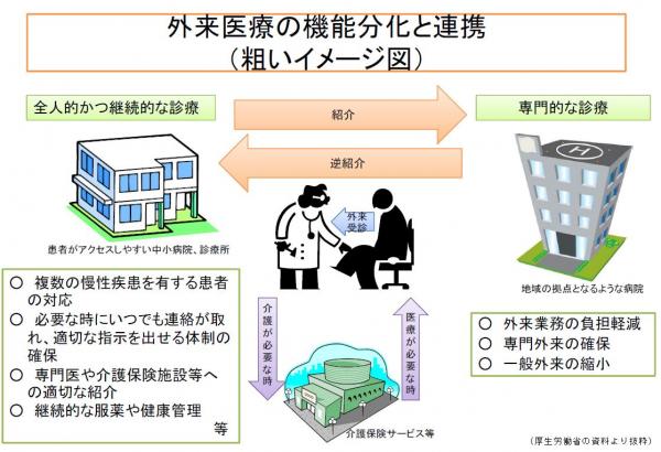 中央社会保険医療協議会(中医協)の総会が23日に開かれ、次期診療報酬改定に向け、外来診療の機能分化に関する議論が始まった。厚生労働省の事務局は、依然として病院の外来患者数が全体の2割強を占め、勤務医の負担となっている現状や、慢性疾患を抱えた高齢者の重複受診が多いという患者像を、議論の前提として説明。イメージ図の中では、「地域の拠点となる病院」の「一般外来の縮小」「専門外来の確保」を盛り込み、「患者がアクセスしやすい中小病院、診療所」に、「複数の慢性疾患を有する患者の対応」「専門医や介護保険施設への適切な紹介」などの役割を明記した。