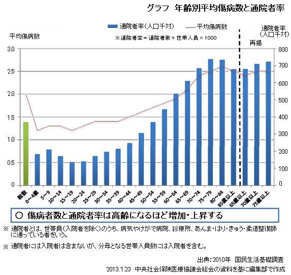 現在は約20%の65歳以上人口の割合は、30年には約32%に跳ね上がるとみられている。病気やけがで病院や診療所などに通院する人の割合は、高齢者ほど高くなるとされる =グラフ、クリックで拡大= 。さらに、若い時に病気がある人は年齢を重ねるにつれて病気も積み重ね、高齢者になったときには、幾つかの病気を持つようになると同省ではみている。