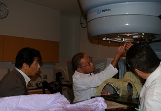 放射線治療部で外側照射装置の説明を受ける田村厚労相(1日、東京都内)