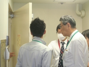 昭和大病院で25日に行われた院内点検で防火戸を確認する有賀徹病院長(右)