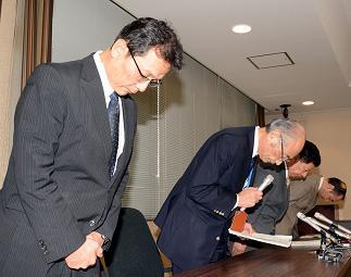 会見の冒頭、一連の騒動について謝罪する馬場学長=中央=ら(31日、滋賀医科大)