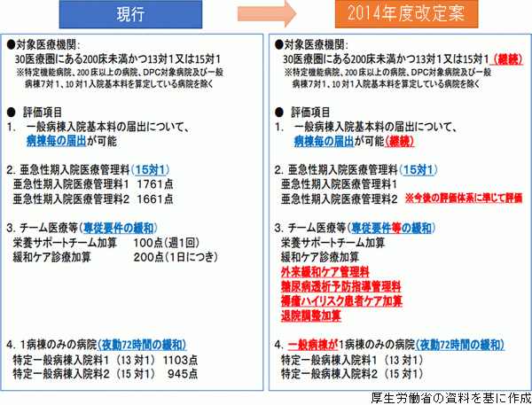 また、人口も医療機関数も少ない中、自己完結した医療を行う医療圏の病院の要件は、一層緩和する。一般病棟入院基本料の病棟ごとでの届け出を引き続き認めるほか、栄養サポートチーム加算などの要件緩和を進め、対象の加算も増やす。14年度の改定で要件を見直す方向の亜急性期入院医療管理料も、要件を一部緩める =表、クリックで拡大= 。対象地域は、現在と同じ30医療圏を想定している。