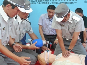 救命処置のデモンストレーションを行う救命士ら。指導者教育の拡充が求められている