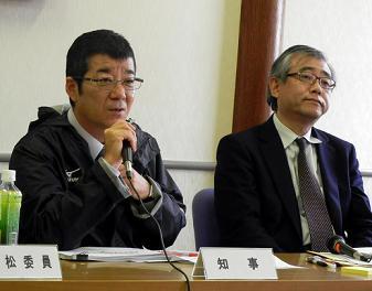 会見で記者の質問に答える松井知事=左=