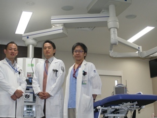斎藤センター長(左から2人目)らスタッフと天井懸架方式を採用した治療室(15日、国がん中央病院)