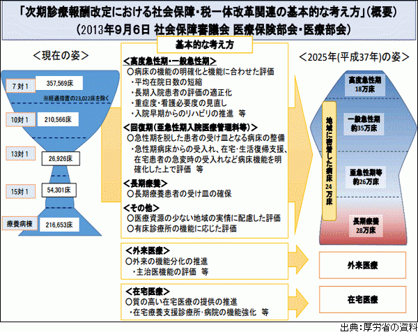 一戸課長補佐は、国が目指す25年の姿で「高度急性期」が18万床、「一般急性期」が約35万床、「亜急性期等」が約26万床などとなっていることを改めて強調 =図、クリックで拡大= 。「現在のままでは今後の人口構造の変化に耐えられないということで、こういう姿が示されている。目指す姿に変わる方向が、今回の改定であまり見られない場合には、また次、その次(の改定)で、いろいろな誘導を掛けることになっていく」と述べた。
