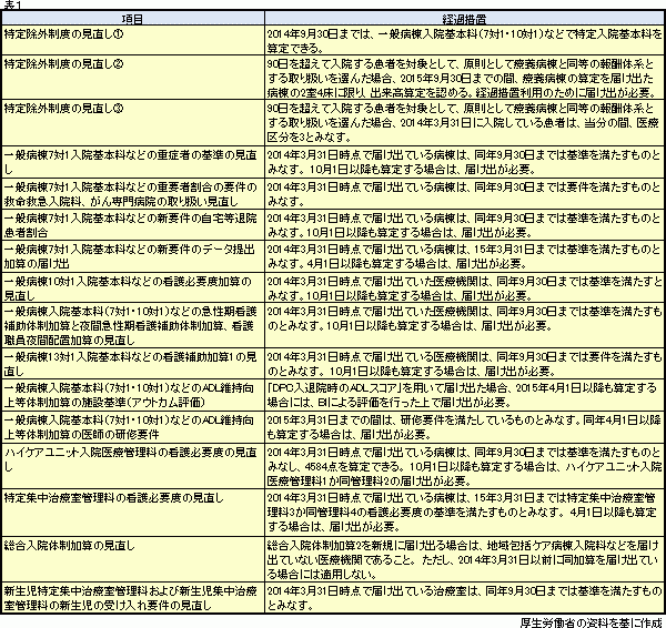 厚生労働省は、2014年度診療報酬改定で設ける経過措置が46項目あるとして、病院団体の説明会などで注意を促しています。経過措置の早見表と共に、それらについて解説します。【佐藤貴彦】