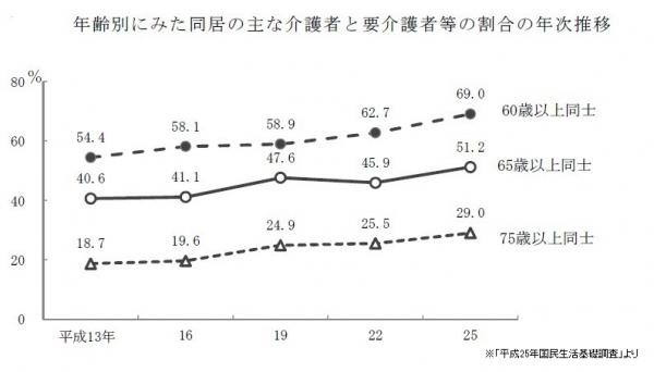 厚生労働省が公表した2013年の国民生活基礎調査の結果には、介護に関するデータも数多く盛り込まれている。データからは、在宅で生活する要支援・要介護者の4分の1強が独り暮らしであることや、介護者が要介護者と同居する世帯のうち、後期高齢者が後期高齢者を介護する“超”老老介護世帯が約3割に達したことなど、急速に深刻化する在宅介護の実態が垣間見える。【ただ正芳】