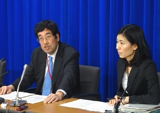 会見する山本座長=左=と同省医政局総務課の大坪寛子・医療安全推進室長(20日、厚労省)