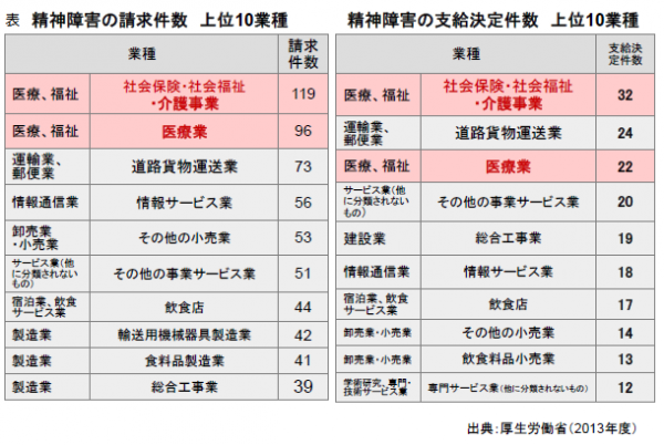 精神障害の補償状況を見ると、グラフ1に示すように労災請求件数も支給決定件数も増えていますが、中でも、介護・医療分野は請求件数、支給決定件数ともに目立って多いことが注目されます=表=。