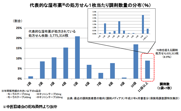 年間の販売額が大きい代表的な湿布薬について、厚労省が今年4月審査分の処方せんを基に分析した結果、一回に調剤する湿布薬が70枚超の処方せんが全体の8.9%を占め、140枚以上が4%近くに上ることが明らかになった =グラフ、クリックで拡大= 。