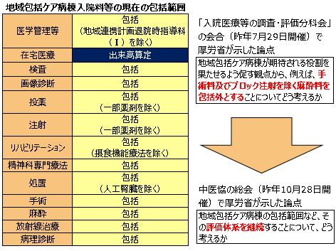 一方、地域包括ケア病棟入院料の焦点は 包括評価の一部見直し です。厚労省は一時、手術料などの出来高算定を認める具体案を提示したものの、その後、16年度改定では同案を見送る方向にかじを切りました =表= 。