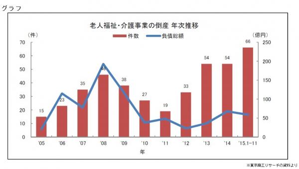 昨年の介護や老人福祉に関連する事業所の倒産件数は、介護保険法が施行された2000年以降で最多となったことが、東京商工リサーチの調査で分かった。特に通所介護事業所などの倒産件数は、一昨年から倍増した。東京商工リサーチでは、深刻さを増す介護職員の不足が事業経営を圧迫していることに加え、昨年4月の介護報酬改定が9年ぶりにマイナス改定となったことも影響したと分析している。【ただ正芳】
