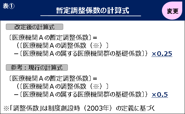 機能評価係数Ⅱと「基礎係数」への「調整係数」の段階的な置き換えが進み、「暫定調整係数」の算出式が変更になる =表①、クリックで拡大= 。ただ、激変緩和措置として、「推計診療報酬変動率(出来高部分も含む)」が2%程度を超える場合は暫定調整係数を再設定する。