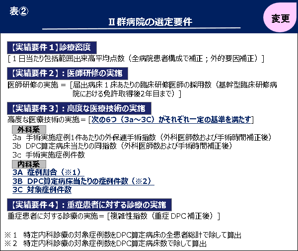 DPC対象病院を3つの病院群に分けてそれぞれで基礎係数を設定する仕組みは維持する。Ⅰ群も大学病院本院のままだが、診療密度などがⅠ群に準じるⅡ群病院の選定要件は見直し、内科系の医療技術の実績を評価する視点を取り入れる =表②、クリックで拡大= 。その結果、「高度な医療技術の実施」は6項目の実績で評価することになり、このうち5項目以上での基準値クリアが要件となる。