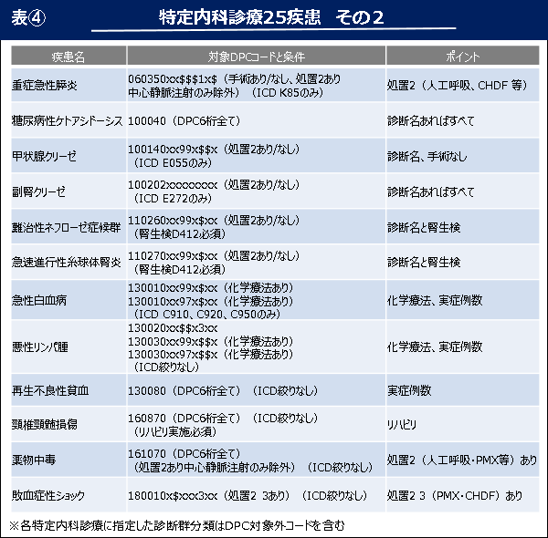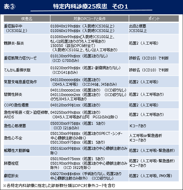 内科系の実績を評価する3項目は、いずれも25疾患 =表③④、それぞれクリックで拡大= の症例数に関するもの。各疾患の対象となる診断群分類などは、内科系学会社会保険連合がまとめた「重篤な急性疾患・病態が高度の熟練を要する技術(特定内科診療)」がベースになっている。