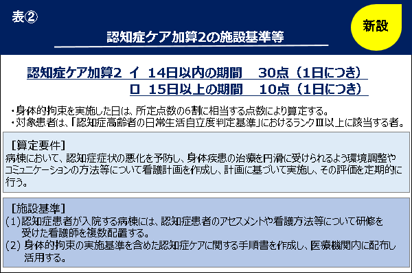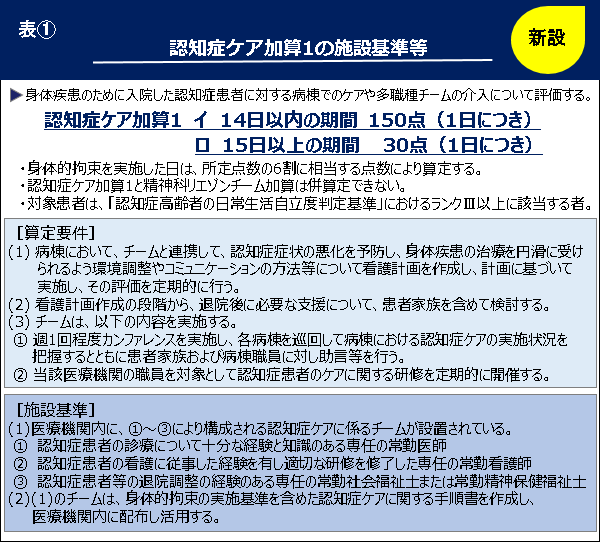 身体疾患と認知症を併せ持つ入院患者の受け入れ体制を整備するため、「認知症ケア加算」を新設する。2区分で、点数が高い同加算1は一定の経験を持つ医師を含む多職種チームによる介入を評価する。一方、同加算2は研修を受けた看護師の配置などが要件。それぞれの施設基準などは、同加算1が 表①=クリックで拡大= 、同加算2が 表②=クリックで拡大= の通り。