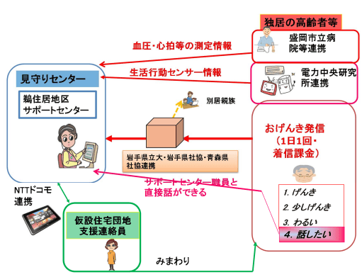 岩手県釜石市の鵜住居(うのすまい)の仮設住宅では、おげんき発信に加え、生活行動を感知するセンサーの情報、血圧・心拍などの測定情報を、ネットワークを通じて鵜住居地区のサポートセンターに集約している。また、仮設住宅団地支援連絡員がタブレットPCを持って仮設住宅などを回り、高齢者の姿を目にして、安否確認情報を入力すれば、サポートセンターに情報が行く仕組みになっている。