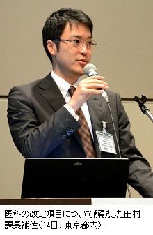 全日本病院協会(全日病)は14日、2016年度の診療報酬改定に関する説明会を開いた。医科の改定項目について解説した厚生労働省保険局医療課の田村圭課長補佐は、DPC制度の機能評価係数IIに新設される「重症度指数」について、「出来高実績点数が高い方が係数自体は高くなるが、医療機関の診療規模のばらつきを埋め合わせるほどのものではない。それが目的でもない」と述べ、医療関係者に理解を求めた。【敦賀陽平】